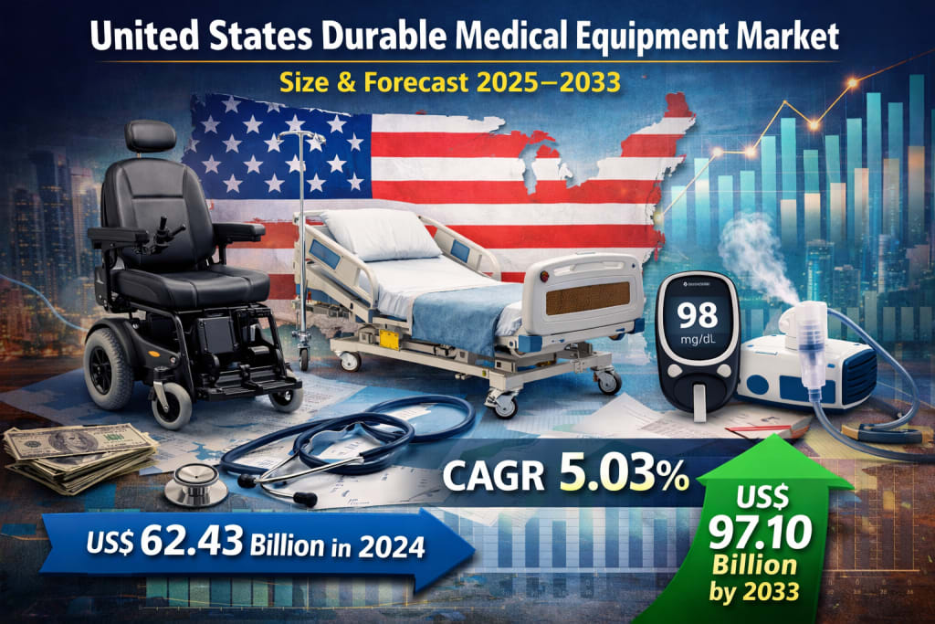 The United States Durable Medical Equipment (DME) market is entering a decisive growth phase as the country’s healthcare system continues its shift toward long-term, patient-centric, and home-based care models. According to Renub Research, the United States Durable Medical Equipment Market is expected to grow at a CAGR of 5.03% from 2025 to 2033, reaching US$ 97.10 billion by 2033, up from US$ 62.43 billion in 2024. This steady expansion is being powered by a combination of demographic, clinical, and technological forces, including the rapid aging of the population, the rising burden of chronic diseases, and continuous innovation in mobility aids, monitoring devices, and therapeutic equipment.