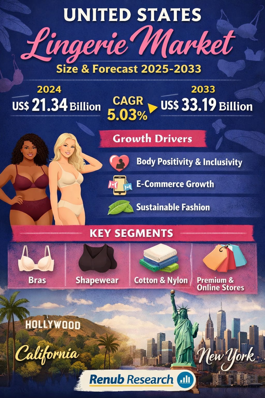 The United States lingerie market is entering a dynamic phase of growth, innovation, and cultural transformation. According to Renub Research, the market is expected to expand from US$ 21.34 billion in 2024 to US$ 33.19 billion by 2033, registering a steady CAGR of 5.03% during 2025–2033. This growth is driven by a powerful combination of evolving consumer values, rising digital engagement, and the redefinition of lingerie as a form of self-expression rather than just a functional garment.