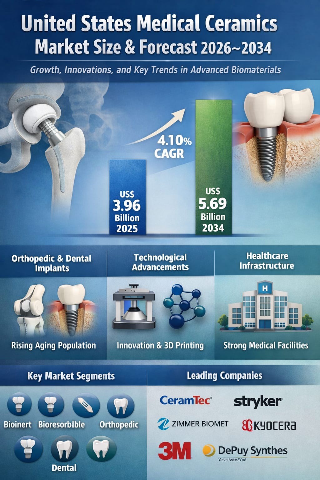 Demographic trends strongly support this trajectory. The U.S. population aged 65 and older is projected to increase significantly over the coming decades, which will naturally translate into higher volumes of joint replacement and dental implant procedures. On the dental side, tooth loss and oral health issues remain prevalent among older adults, further strengthening demand for ceramic-based dental solutions.