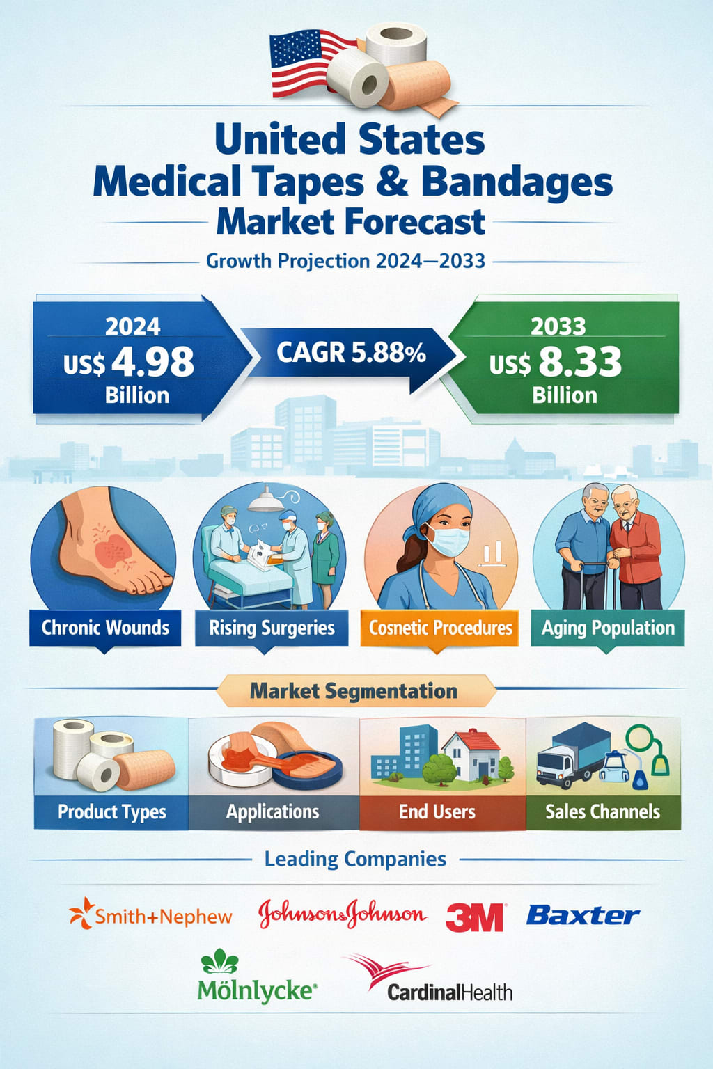 According to Renub Research, the United States Medical Tapes and Bandages Market is expected to reach US$ 8.33 billion by 2033, up from US$ 4.98 billion in 2024, growing at a CAGR of 5.88% from 2025 to 2033. This steady expansion reflects more than just rising consumption—it signals a broader transformation in how wounds are treated, monitored, and managed across hospitals, clinics, and home care settings.