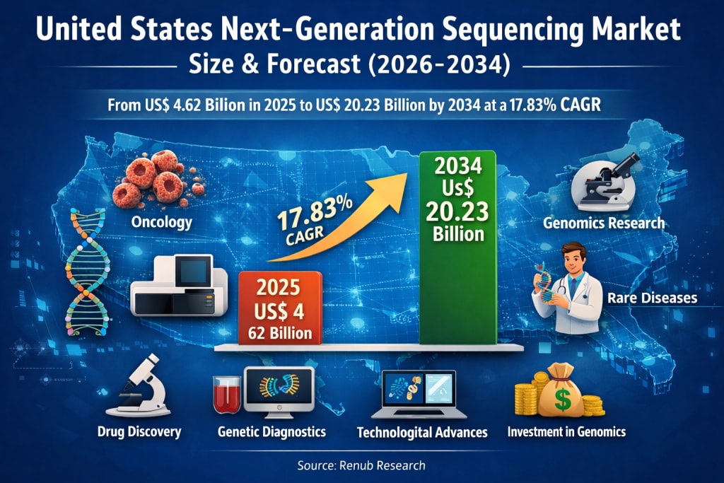 The United States Next Generation Sequencing (NGS) market is entering a powerful growth phase, driven by rapid technological innovation, expanding clinical applications, and the accelerating shift toward precision medicine. According to Renub Research, the U.S. NGS market is projected to grow from US$ 4.62 billion in 2025 to US$ 20.23 billion by 2034, registering a robust compound annual growth rate (CAGR) of 17.83% during 2026–2034.
