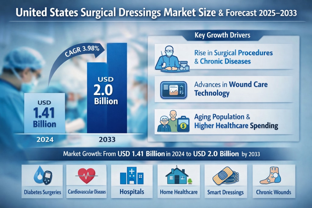 The United States surgical dressings market is entering a period of steady and resilient growth, supported by rising surgical volumes, continuous innovation in wound care technologies, and an increasing emphasis on infection prevention across healthcare settings. According to Renub Research, the United States surgical dressings market is expected to grow from USD 1.41 billion in 2024 to nearly USD 2.0 billion by 2033, registering a compound annual growth rate (CAGR) of 3.98% from 2025 to 2033.
