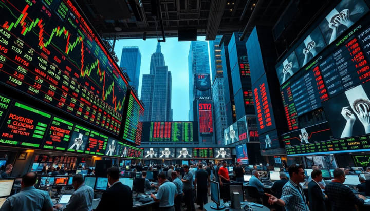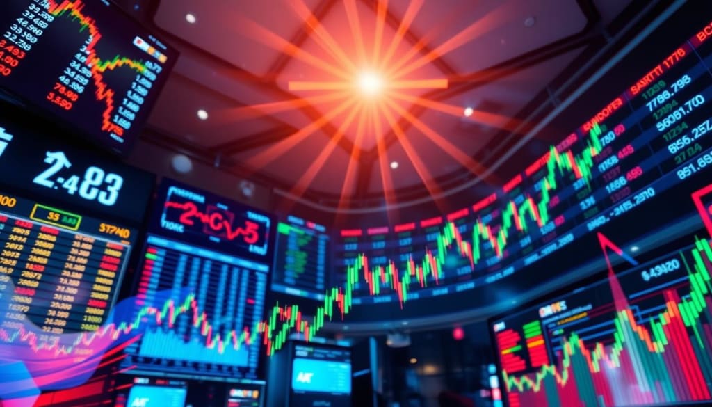 A dynamic stock market scene depicting high trading volume, vibrant green and red candlestick charts, bustling trading floor with intense activity, digital screens displaying fluctuating stock prices, energetic traders engaged in analysis, and a backdrop of skyscrapers representing financial districts.