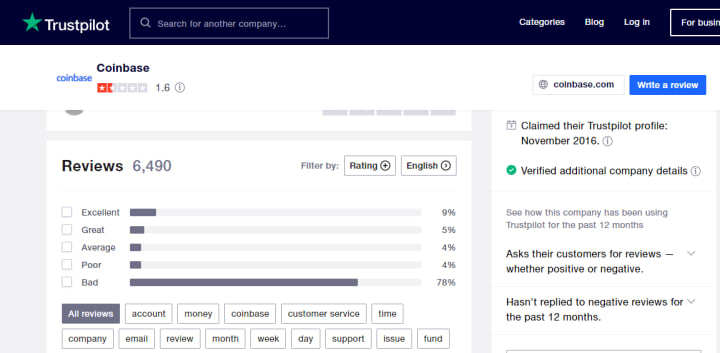 However, when I looked at Trust Pilot for Coinbase, out of 6,400 reviewers, 78% of those said their experience with Coinbase was bad or terrible, as opposed to only 18% who rated them excellent, great, or even average.