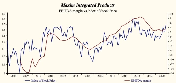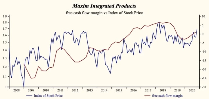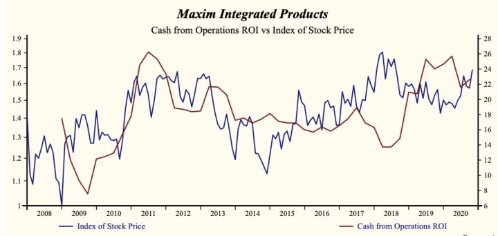 Maxim Integrated Products Inc. (NASDAQ:MXIM) has been an exceptionally profitable company with persistently high cash return on total capital of 20.7% on average over the past 21 years. Over the long term, the shares of Maxim Integrated Products have declined by 7% relative to the broad market index.