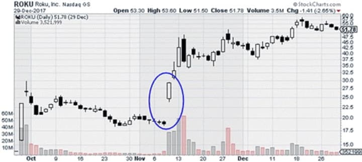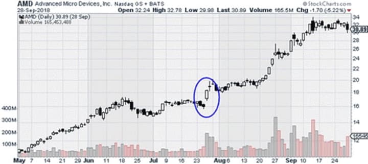- A big “gap up.”This is where a stock shoots up much higher than where it closed the previous day. Ideally, a stock will also break out to near all-time highs… or at least break through prior resistance levels.
