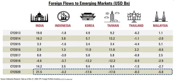 India receives highest FII inflows among emerging markets in 2020