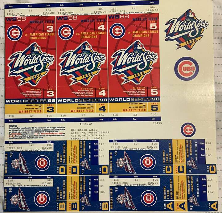 10. 1998 Chicago Cubs World Series Tickets - I know what you’re thinking, the Chicago Cubs didn’t go to the 1998 World Series. They did however, on the strength of pitcher Kevin Tapani’s 19 win season, get to the playoffs where they were swept by the Atlanta Braves to bring an end to their season. That however, did not stop the Chicago Cubs front office from being prepared just in case the team managed to end years of World Series frustration. It didn’t happen but many hopeful fans were nevertheless able to obtain Chicago Cubs World Series tickets before the team was booted from the playoffs and had to wait 18 more years for the chance to see the Curse of the Goat come to an end.