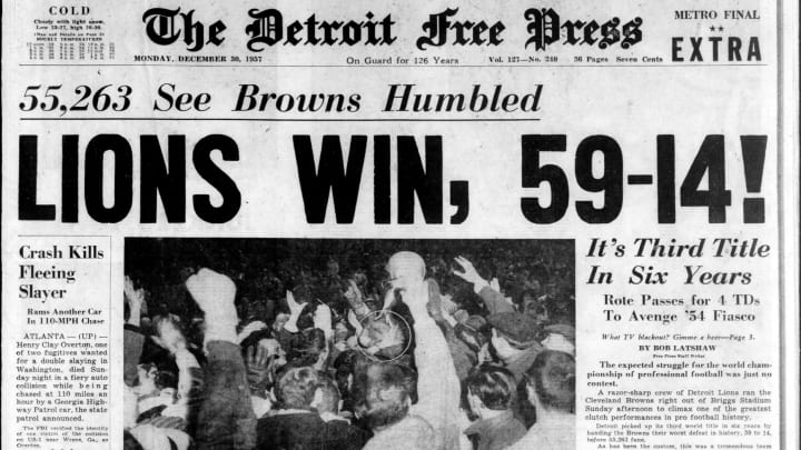 Once upon a time, sports fans, the Detroit Lions were actually a juggernaut. Even crazier, so were the Cleveland Browns. The Lions were quite a strong team in the 1950s, having won back-to-back NFL Championships to join the one they captured all the way back in 1935. The Lions entered the 1957 season a year removed from narrowly losing the NFL's Western Conference; finishing a half game behind the Chicago Bears in the standings.