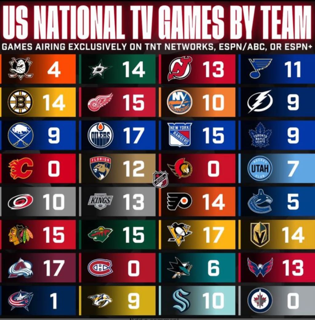 Here's where the scrutiny from me comes in. When I looked at the smaller numbers, I couldn't help but notice something. The Toronto Maple Leafs, a perennial playoff team who has one of the best goal scorers in the league, only have nine national TV games here in America. That's the same amount as the Tampa Bay Lightning and the Buffalo Sabres. Oh, and the Vancouver Canucks, who almost made the Conference Finals last year? Only five such games. The Utah Hockey Club (7) and the San Jose Sharks (6) have more than Vancouver. That is absolutely insulting!
