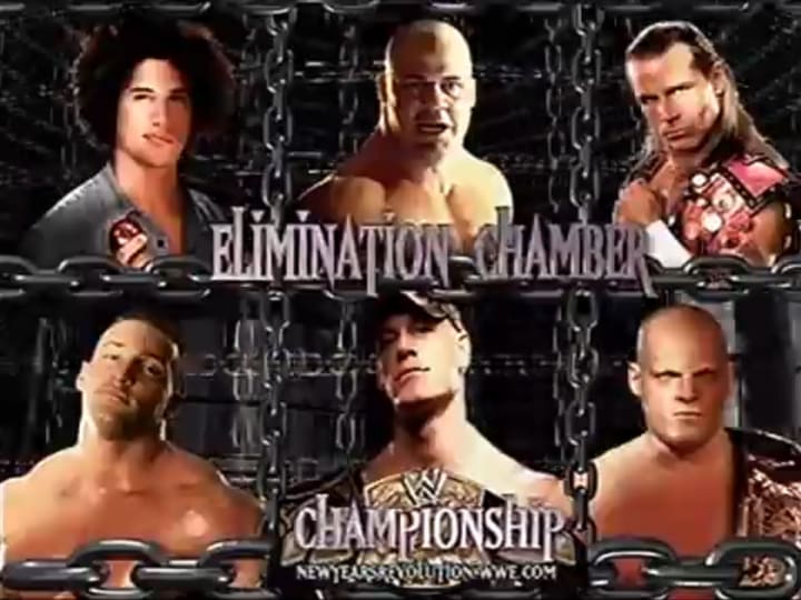 New Year's Revolution 2006: Bischoff was fired as GM a week later, but Cena would have to deal with one piece of Bischoff's legacy: the Elimination Chamber. The main event for New Year's Revolution was set, with Cena defending the WWE Championship inside the aforementioned structure. His opponents: Shawn Michaels (who was entering his third Chamber as a competitor; he was the referee in the 2005 Chamber), Kane (who was in the first Chamber), Kurt Angle, Chris Masters, and Carlito. Not only was Cena (as well as Angle, Masters, and Carlito) in his first Chamber, he had to start the match with Shawn Michaels, but in spite of all of that, Cena won and retained.