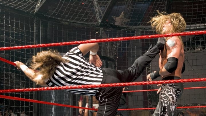 The Referee: Before the event, Eric Bischoff made another announcement: the special guest referee for the Elimination Chamber match would be none other than Shawn Michaels, who participated in both of the previous two Chamber matches, and won the inaugural one in 2002. I recall that Michaels was promoted to be a bit of a wild card, as he had history (mostly bad) with all of the combatants involved, especially Triple H. The main combatant who wasn't happy with Michaels being the referee: none other than Edge.