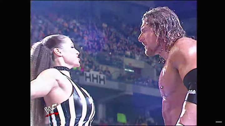 Triple H let Stephanie really have it for her deception, and loudly announced that their marriage was over, after which The Game delivered a Pedigree to Vince. Triple H shoved down Stephanie, who gave her famous angry roar in response, but she wouldn't be done there. Three days later on SmackDown (Valentine's Day), Stephanie promised a huge surprise for Triple H at the end of the evening, and boy did she deliver! As Triple H was being beaten down, Stephanie revealed her surprise: she would be the guest referee in his match against Kurt Angle. Yikes!