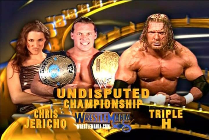 Aftermath: At WrestleMania X8, Triple H won his fifth World Championship, and at the time, all of those reigns were with the WWF Championship. So Triple H accomplished that goal on that night, and eight days later on Raw, he accomplished another goal: getting Stephanie out of his life for good. Triple H actually retained the Undisputed Championship in a Triple Threat Match against Jericho and Stephanie, and because he pinned the latter, Stephanie was gone from the WWF (it wouldn't be for long; Stephanie returned to the renamed World Wrestling Entertainment as SmackDown's babyface General Manager). Triple H's run as Undisputed Champion wasn't a long one; he would lose the title to Hulk Hogan at Backlash, but would defeat Jericho inside Hell in a Cell at Judgment Day to end that feud.