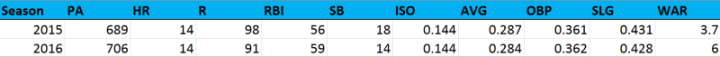 Eaton had remarkably similar years offensively from 2015 to 2016. His number stayed roughly the same all the way across the board — except for his fWAR, which increased 2.3 fWAR. Eaton received a huge boost to his value because the White Sox started him predominantly in right field instead of center field.