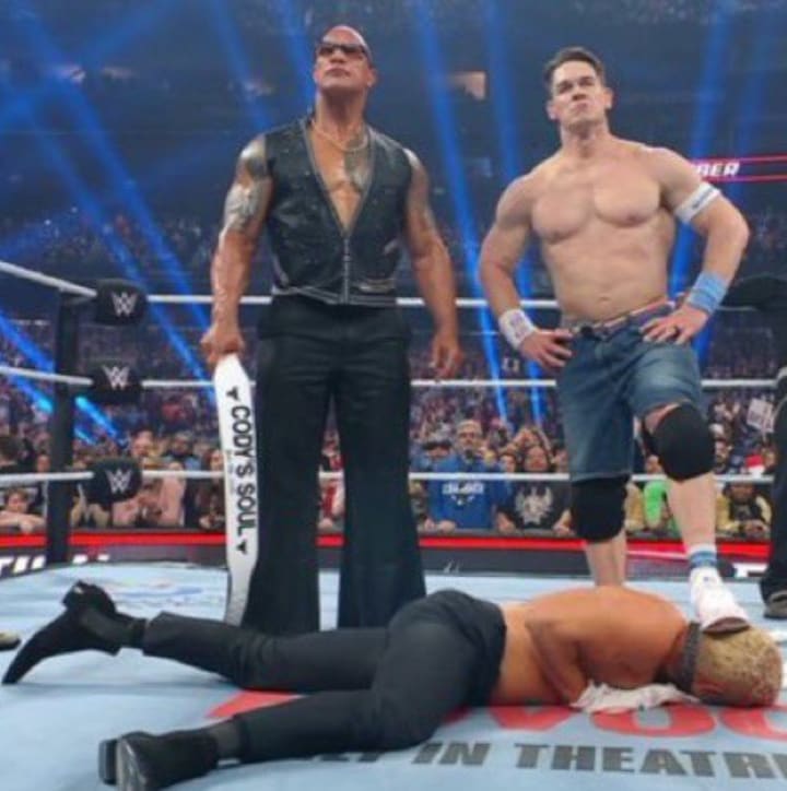 From the moment Rock appeared, I was nervous as hell. Cody says no, like I knew he would. Then Cena hugs Cody. Look at that look on Cena's face. That's why I was nervous. Because I saw this coming. Not a mile away, but I read theories about this, and I went, "OMG it's going to happen." And with one swift kick between Cody's uprights, there it was. It happened, folks. John Cena sold out. John Cena turned heel. I've said a lot of impossible statements in sports before. "The Boston Red Sox win the World Series." "The Chicago Cubs win the World Series." "The NFL's in LA." I never thought I would say, in this WWE climate, "John Cena turned heel." And you know what's the only downside about this? Toronto saw a Cena heel turn before they saw another Stanley Cup. Though the optimist in me has to say that one is coming to Toronto.