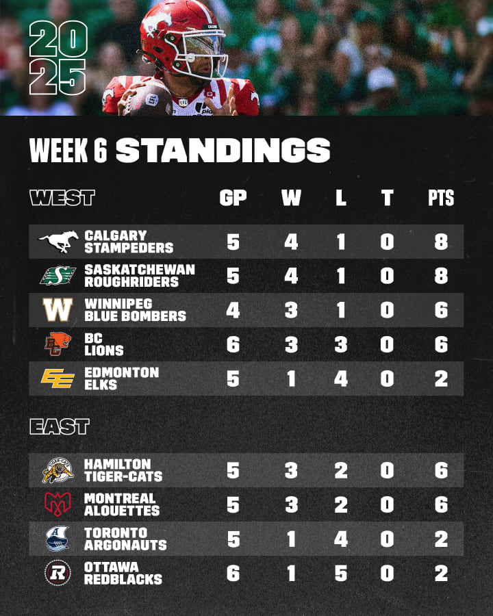 No, you are not seeing things. The Hamilton Tiger-Cats are in first place in the East Division. It's via tiebreaker, but first place is first place, can't argue with the facts and numbers. Hamilton is leading the tepid East Division, while the Montréal Alouettes stand in second place. The Toronto Argonauts remain at 1-4, but we are ahead of the Ottawa Redblacks, who stand at 1-5. As for the West, the Calgary Stampeders' win over the Saskatchewan Roughriders moved both teams into a first place tie, but it's Calgary sitting on top of the West. The Winnipeg Blue Bombers remain in third place at 3-1, but the BC Lions (the only team to play in every week so far) are close behind at 3-3. The Edmonton Elks have a lot of catching up to do in the standings, but there is a lot of time in the season for them to do it. Same with the Argos in the East, because we would still not be in the playoffs if the season ended at this point.