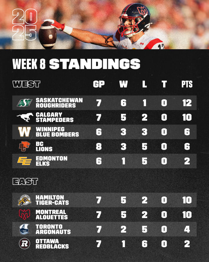 The 2025 CFL season now enters what I call the heart of the schedule, that middle seven weeks before things get serious. This part of the season begins with Week 8 and tails off with their annual Labour Day Weekend matchups, and after Week 14, that's when things get very interesting. Week 8 started off in Calgary, as the Stampeders hosted the Montréal Alouettes in a battle of teams on strong starts. The Stamps entered the fourth with a lead, but the Als took it, 23-21, as they attempt to keep pace with the Hamilton Tiger-Cats in the Eastern Division.