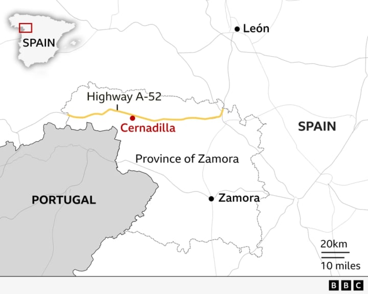 Map showing the province of Zamora, in Spain, the highway A-52 and the town of Cernadilla, where Diogo Jota's car crashed