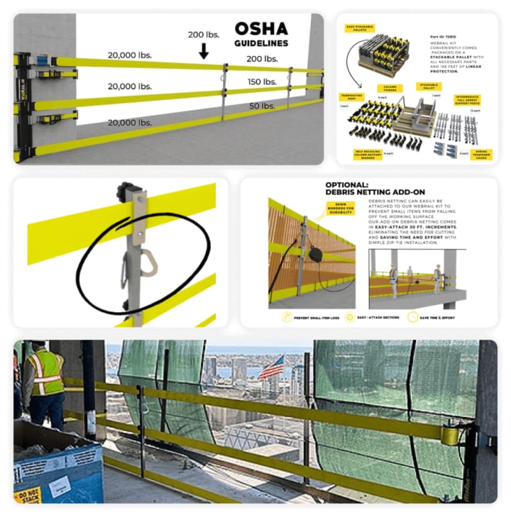 In conclusion, the Web Rail Edge Protection system is a groundbreaking solution that revolutionizes fall protection. With its non-penetrating design and simultaneous passive protection and fall arrest capabilities, it sets a new standard for worker safety. The convenience of a bundled pallet, complete with all necessary components and 186 feet of linear protection, makes installation quick and easy. By attaching to the vertical fall arrest support instead of the building column, the system effectively mitigates the risk of collisions with the floor or columns in the event of a fall. It is designed to work seamlessly with lanyards or SRL vertical fall protection lifelines, providing optimal protection for workers. With its adaptability, robustness, sturdiness, and regulatory compliance, the Web Rail Edge Protection system ensures worker safety and meets OSHA standards. Invest in the finest safety rail available and prioritize the well-being of your workers with Web Rail.