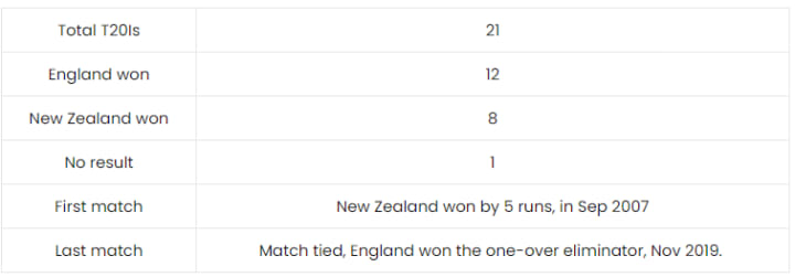 England vs New Zealand T20Is Head to Head stats: