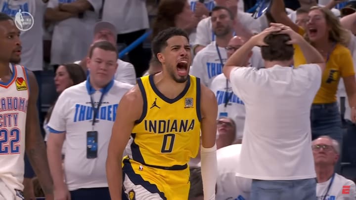 Clutch shots, big threes when they needed them, free throws at the right time, and all of a sudden, it was a one point game very late. Pascal Siakam knocking the ball out of bounds and not getting a foul call in his favor looked like it would be the end for Indy in Game One. Thunder had the ball, it was in the hands of the reigning NBA MVP, Shai Gilgeous-Alexander... and he missed the lay-up. Indy rebounds, the ball ends up in the hands of Tyrese Haliburton, and...