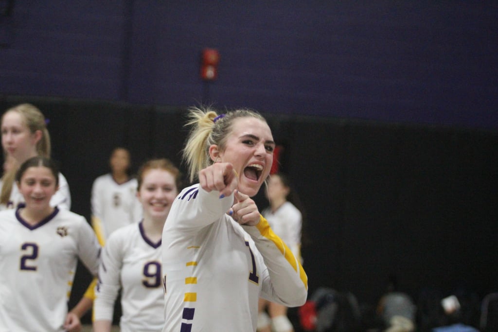 Of course, volleyball jerseys don’t just go to the rafters by playing above the net. Riley Buckingham, Haley Hoskins and Olivia Casabona all went to the floor with saves, and the defenders were rewarded with the point when Pelham spiked the ball into the net.