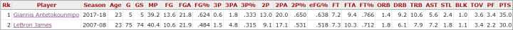 Heading into his fifth year, Giannis simply looks better than LeBron did at that point. Based on his current stats and how it compares to LeBron as an up-and-coming superstar in the league, that is two victories over the King.