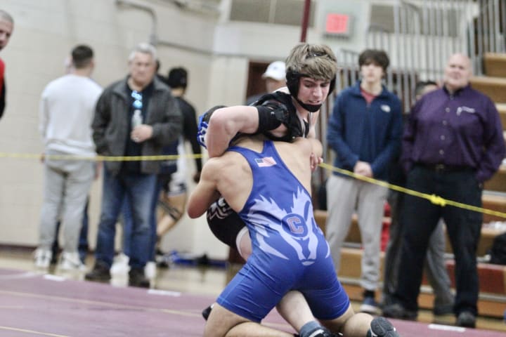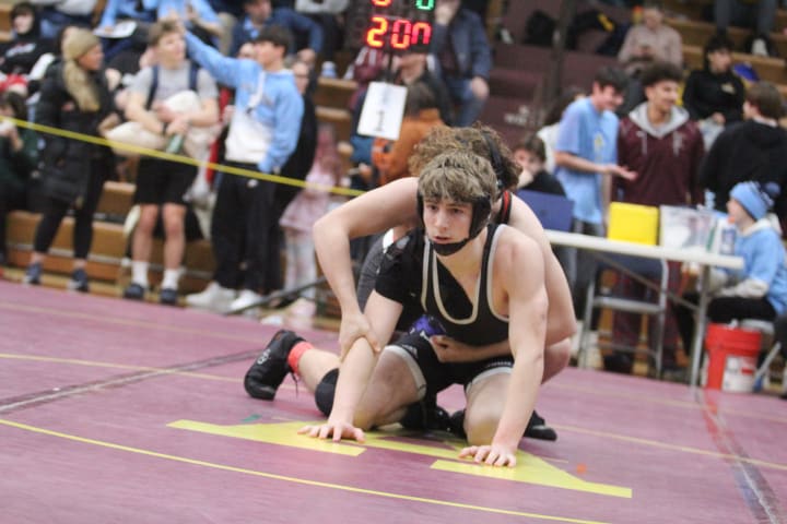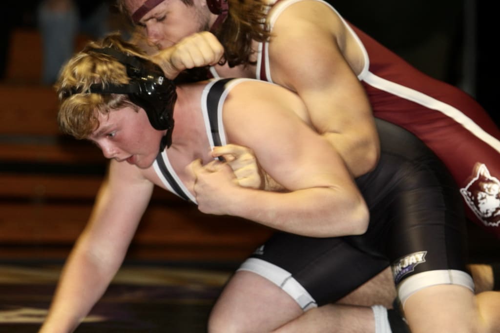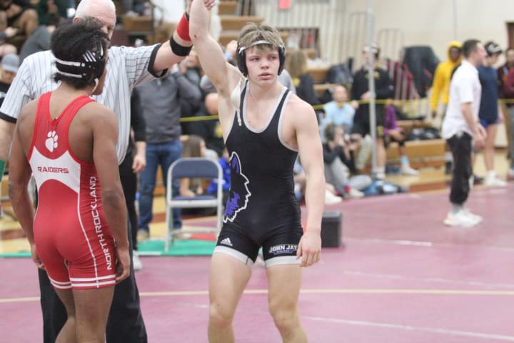 John Alia didn’t fare as well and was pinned 33 seconds into the match. No problem it seemed when JoJo Kern mauled his opponent to an 11-0 lead. That is until Kern got a front row seat to John Jay’s ceiling.