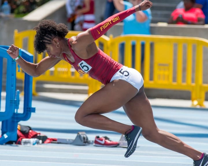 USC sophomore Twanisha Terry took first place in the 100-meter dash at the 2019 Power 5 Trailblazer Challenge, hosted by the University of Miami, in Coral Gables, Fla., March 23.