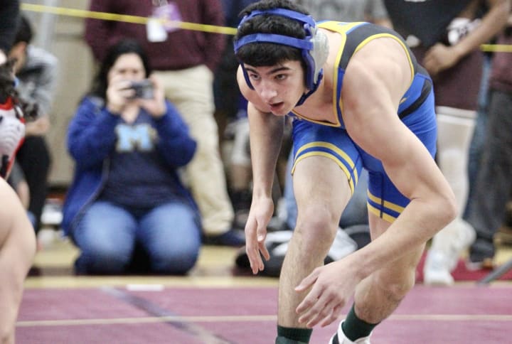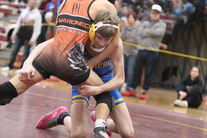 Up 17-0, Mahopac finally faltered at 138. Emmanuel Perez lost a 6-2 decision to Dom Bronzi, but Perez was soon picked up. Nico Greco went full tilt at 145 and used a half to dispatch Jason Hansen only 56 seconds into the first.