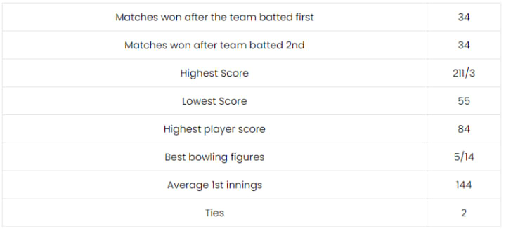 The pitch has not been siding with batters. The average first innings score at the pitch implies that making successful runs has been difficult. The toss factor also plays a crucial role in these grounds for chasing teams that have won in all the seven games of the T20 that have been held on these grounds.