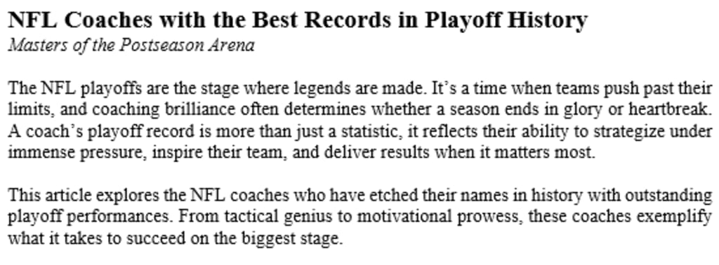 This article explores the NFL coaches who have etched their names in history with outstanding playoff performances. From tactical genius to motivational prowess, these coaches exemplify what it takes to succeed on the biggest stage.