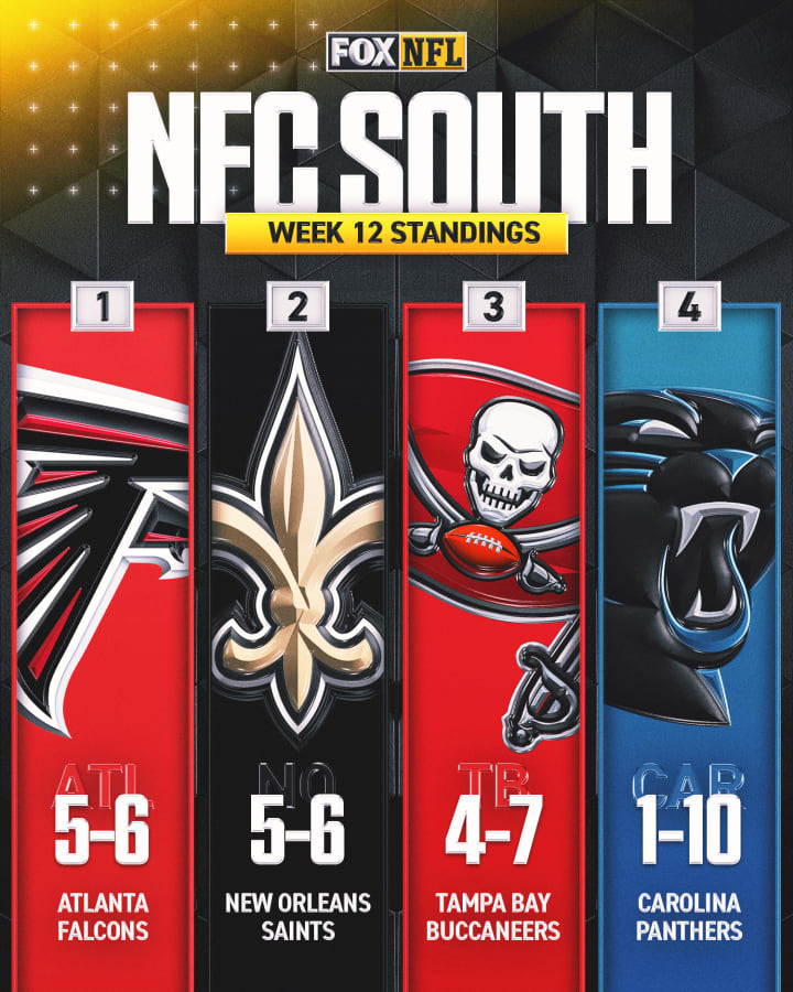 I didn't think it was possible, but the NFC South is actually worse than it was last year. I do love trainwreck divisions, but here's the thing: that trainwreck label usually lasts just one season and gets passed around. After 12 weeks, the NFC South collectively has fewer wins this year (15) than they did after 12 weeks last year (18). And guess who is leading the NFC South entering the month of December? That's right, the Atlanta Falcons. The Falcons defeated the New Orleans Saints, 24-15, to move into a tie for first in the division, with Atlanta having the head-to-head tiebreaker. The Tampa Bay Buccaneers fell to the suddenly hot Indianapolis Colts, and the Carolina Panthers, well...the less said about them, the better. Here's the thing about trainwreck divisions. When a team falls out of first place in one, they fall deep in the conference. Regarding the Saints, they entered Week 12 leading the division, and holding the #4 position in the NFC. With that loss, they fell from #4 to #10 in the conference. Ouch.