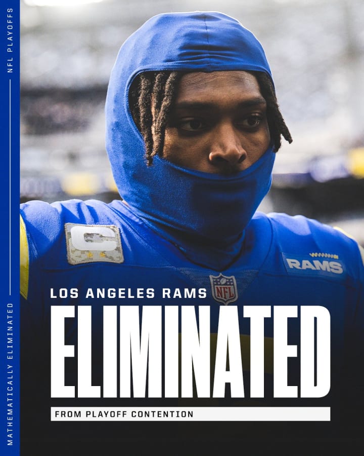 The Rams' season is over. With this loss, they have been officially eliminated from playoff contention, and before Christmas at that! This has been a very disastrous season for the Rams. It was supposed to be a celebration of their Super Bowl championship, but it ended up being one catastrophe after another. Injuries, defensive miscues, offensive miscues, you name it. The indignity doesn't end there. At 4-10, they are on their way to surpassing the record for most losses by a defending champion (their next loss will set the record). The Rams were one of two NFC teams to be eliminated this week; the Arizona Cardinals were eliminated a day prior with their loss to the already eliminated Denver Broncos.
