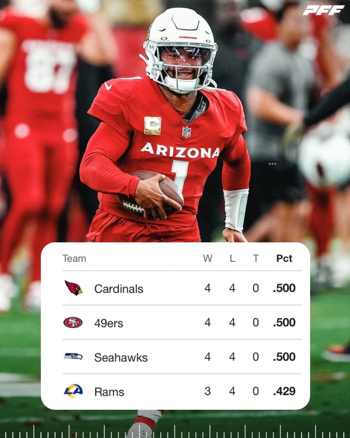 The week began with the Los Angeles Rams picking up a huge win over the Minnesota Vikings on Thursday Night Football, and as a result, the Rams improved to 3-4 and pushed the San Francisco 49ers to last place via tiebreaker. Regarding the rest of the division, the Arizona Cardinals faced a Miami Dolphins team who had Tua back in action, and Zona won via a last second field goal. After that, the Seattle Seahawks were blasted by the Buffalo Bills, and on Sunday Night Football, the Niners eked out a win over the Dallas Cowboys. As a result of this, the Cardinals and Niners improved to 4-4, and the Seahawks dropped to 4-4. And who is in first place after all this mess? The Cardinals. They have a win over the Niners, and they're 2-0 in division play. Niners are the second place team via tiebreaker over the Hawks, and the Rams went from 1-3 to being a half game out of the division lead.