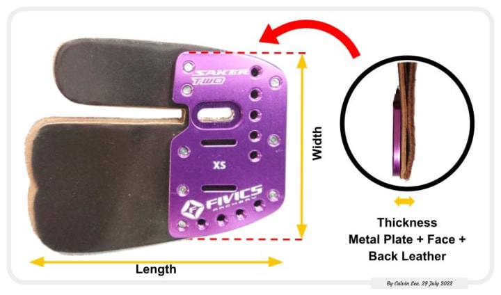 A third dimension which is easily being ignored is the thickness of the finger tab. Difference size finger tabs usually come with the same thickness metal plate main part. It is a less significant issue if the archer's fingers are long. However if the fingers are not long, the combination of thickness of the metal plate and the face / back leather will be a big concern. Many archers will find it difficult to bend their fingers and keep the hook shape in order to hold the string. It is not uncommon archers fail to form a solid connection with the string, or are forced to switch to shallow hooks because the finger tab is too thick.