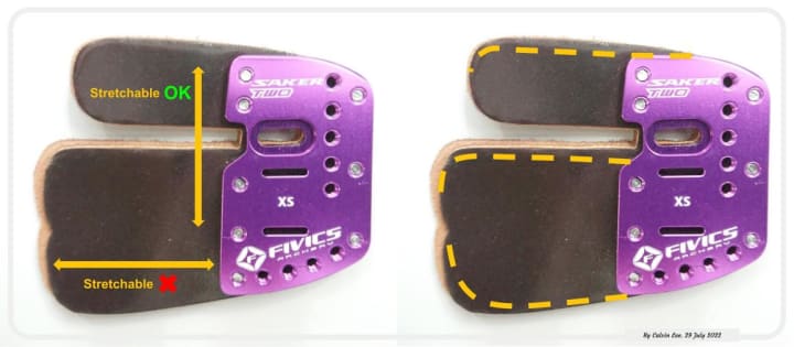 Stretching. Another reason why I never like to use factory cordovan. For over 10 years the first thing I do with a new finger tab is change the cordovan. Factory cordovan looks shiny, smooth and nice. However, it is not always in the correct direction. It might be because the cost is so high that factories would like to utilize the whole piece of cordovan. One might know cordovan does stretch, though not as much as other leathers. But it is less known that stretching doesn't appear uniform in all directions. The natural stretching direction must be taken into consideration when making the finger tab face. If the stretching side runs along the finger, which is wrong, the face will over-stretch easily. The face will become thin and deform into unwanted shape quickly. Sadly to say finger tabs always come with random face directions. The natural stretching direction is not always put into consideration while the finger tabs are being produced.