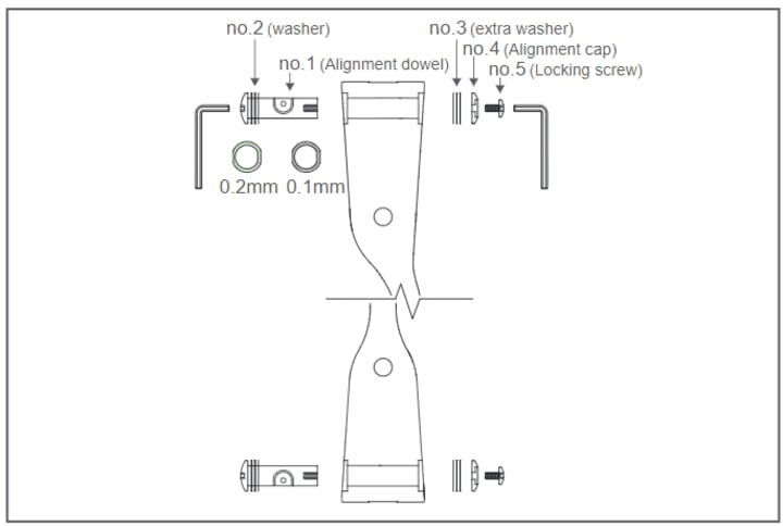 The system is totally fine in function and does a good job in centering limb alignment. As the alignment is adjusted by moving washers of fixed thicknesses. The number of washers used and their thickness can be quantized. This makes adjustment repeatable and easy to record. Hoyt has been using this style of solid limb adjustment system in their top model handles for many years but changed to the third style, which is to be covered below, in 2019. MK Korea is still applying this style of limb adjustment system.