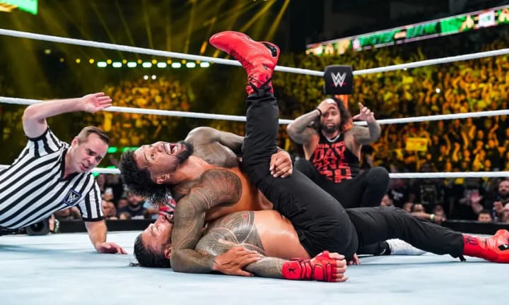 Roman Reigns was pinned. For the first time since December 2019--before the pandemic, mind you--Roman Reigns was pinned one, two, three, in the middle of the ring. The highly anticipated Bloodline Civil War served as the main event of Money in the Bank 2023, and on one side, Roman Reigns (the undisputed Universal Champion) and his cousin, Solo Sikoa. The other side: Jimmy and Jey Uso--Roman's cousins and Solo's big brothers, who ousted themselves from The Bloodline. This was a long time coming, though the build for this started when Roman started disrespecting the Usos following their tag title loss at WrestleMania. Jimmy delivered a long overdue superkick to the Tribal Chief at Night of Champions, and after weeks of speculation, Jey finally sided with his twin brother.