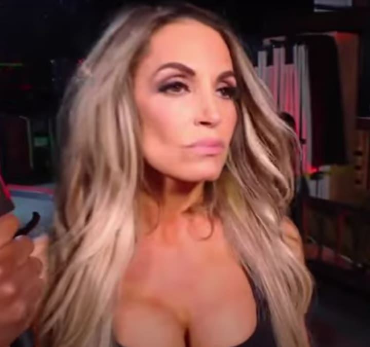 Trish didn't waste any time displaying her reborn heel persona after the attack; Byron Saxton attempted to get answers from Trish backstage, but in response, the evil Trish simply walked past Byron and gave an ominous and blank expression while doing so. I've wanted Trish to become a villainess in WWE just one more time for a long while. I had given up on this until a month ago, when I read that WWE was planning on this. Trish teased a heel turn several months ago; prior to returning to Raw in Toronto, she stated in an interview that her heel persona could give Becky Lynch a run for her money. Clearly, WWE heard this and decided, "Let's go for it."