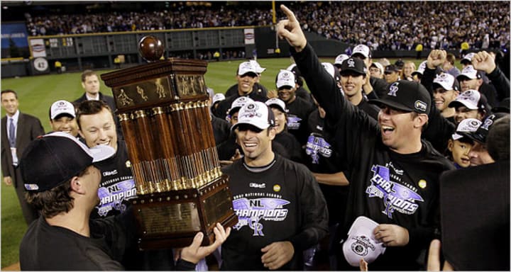 2007. The dream year. The Rockies went on a winning tear that drew them into a tie with the Padres for the National League's lone Wild Card spot. Rockies won in extra innings to advance, and the tear continued. Swept the Phillies in the NLDS. Swept the Diamondbacks in the NLCS. The Rockies, in their 15th season, were in the World Series for the first time in franchise history. Yes, folks, the Rockies have a pennant, but the Mariners don't. The Rockies were swept by the Boston Red Sox, but still, this was a dream year for the Rockies.