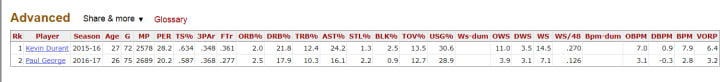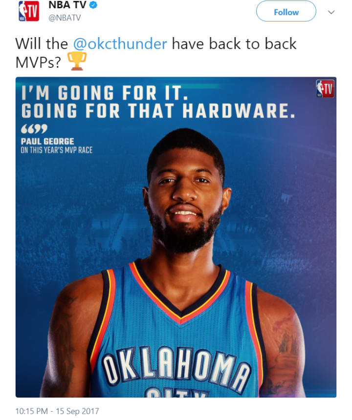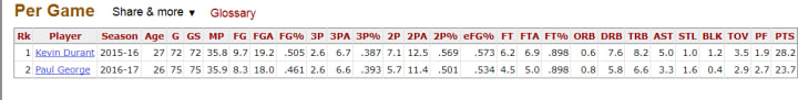 George’s stats are similar but clearly a downgrade. That Thunder team still couldn’t beat the Warriors before they added Durant to the mix. PG-13 might have to bump that rating up to an R and start slaughtering basketball hoops on a nightly basis like Russ did last season, which he apparently intends to do by bringing the MVP trophy back home to Oklahoma City.