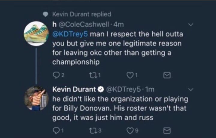 That brings us to the Oklahoma City Thunder. Normally, pairing an All-NBA superstar in Paul George with an MVP who just broke the record for most triple-doubles in a season would be enough to propel a team to the NBA Finals, but we don’t live in a normal NBA anymore. We live in a world where we can actually take advice from what Kevin Durant said on his fake-Twitter and use it properly in context to describe this current Thunder team.