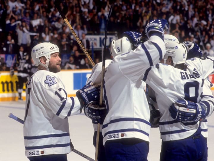 Both the Blackhawks and Red Wings were upset in the opening round by the Maple Leafs and Blues, respectively. In the Norris Final, seven games were needed, but this time, the Leafs won Game Seven to claim the Norris Division championship, and reach the Final Four for the first time in 15 years. Their opponents in the Campbell Final were the Los Angeles Kings. We all know how this ended: Leafs led the series 3-2, Game Six was in OT, and Doug Gilmour was high-sticked by The Great One. Kerry Fraser didn't call it. As for Gretzky, he scored in OT to force Game Seven, where the Leafs fell due to The Great One's hat trick. Ouch.