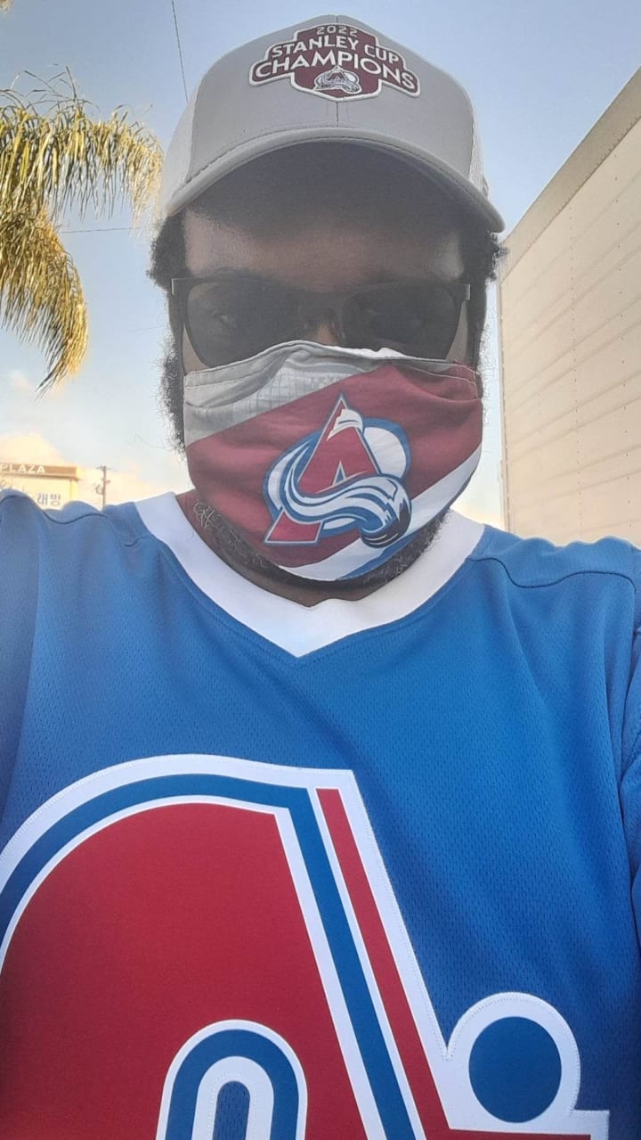 Overall, the team I've been rallying behind for over 30 years is in Year #50 in play. That's part of my reason for this story. The other part is this photo. I am proudly representing both halves of my favorite team: the Quebec Nordiques and the Colorado Avalanche. I didn't really get to enjoy the Nordiques; I followed hockey via the sports section and didn't have cable as a kid. By the time I did get cable and get to watch more hockey, the team was in Denver playing as the Avalanche, but I have enjoyed watching the Avs show out, kick ass, and win three Stanley Cups. In the time that has passed, I've learned more and more about who my team used to be, and I continue to be in awe of everything Nordiques--from the rivalry with the Canadiens, to the logo and jersey. It sucks that we couldn't win one Cup in Quebec, but we are still champions regardless--three-times over.