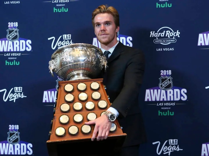 In his first year, McDavid racked up 48 points in 45 games, with sixteen of those points being goals. A point per game in his rookie season isn't bad, though McDavid finished third in voting for the Calder Trophy, which went to Artemi Panarin that season. McDavid would start to get used to this whole point per game thing on the following season, as he picked up an even 100 points (30 G/70 A) and captured his first Art Ross Trophy as the league leader in points, and also won the Hart Trophy as the league's MVP. He would also get his first taste of the playoffs that year, as the Oilers returned to the playoffs for the first time since 2006--the year that saw them one win away from capturing the Stanley Cup. The Oilers had a decent run, falling one win short of reaching the Western Conference Final. As for McDavid, he had nine points (5 G/4 A) in 13 playoff games.