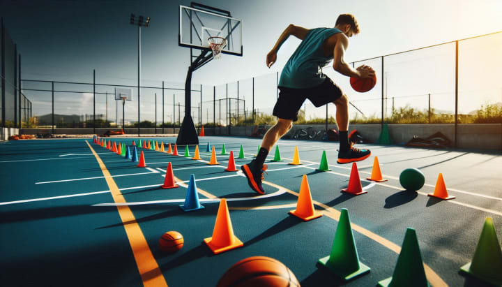 Agility training is key for quick movements and fast reactions in basketball. Cone dribbling drills are an effective way to improve agility. By navigating through cones, you enhance your ability to swiftly change direction and keep the ball under control.