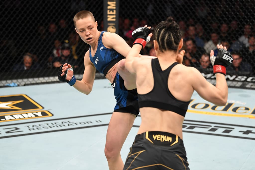 The Rose Namajunas head kick that ended her bout was similarly perfect. The blow looked to be heading into the thigh of Weili but reared to catch her flush on the jaw. She too collapsed to the canvas and the fight was over. Namajunas was at a distinct power disadvantage in this bout but the human jaw is not designed to absorb such force. An effective head kick must be disguised and loop over an opponent’s shoulder to find its mark, and Namajunas executed the technique flawlessly. Weili offered no defence to the strike and was completely unable to continue. She did remonstrate with the ref, but once she watches the tape there can be no case made for an early stoppage.