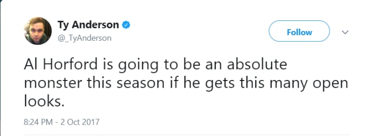 It's easy to overreact during the preseason considering players like Kyle Kuzma are currently lighting the league on fire, but Horford's stat line should indicate just how ridiculously efficient he should be in this offense. In the two preseason games he played with the new-look Celtics, Horford shot a ridiculous 40% from deep and averaged 3.5 assists in just over 17 minutes per game. If he comes close to seven assists a game and shots at that kind of clip from three, it's going to be hard to deny how important he is to this offense.